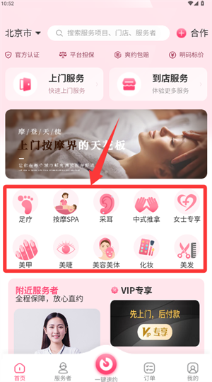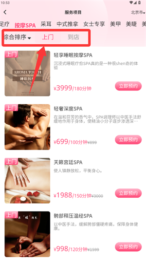 2、在首页分类中找到所需服务,例如按摩或SPA等项目。