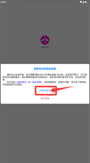 1、启动应用后请仔细阅读用户协议,确认后点击同意并继续。