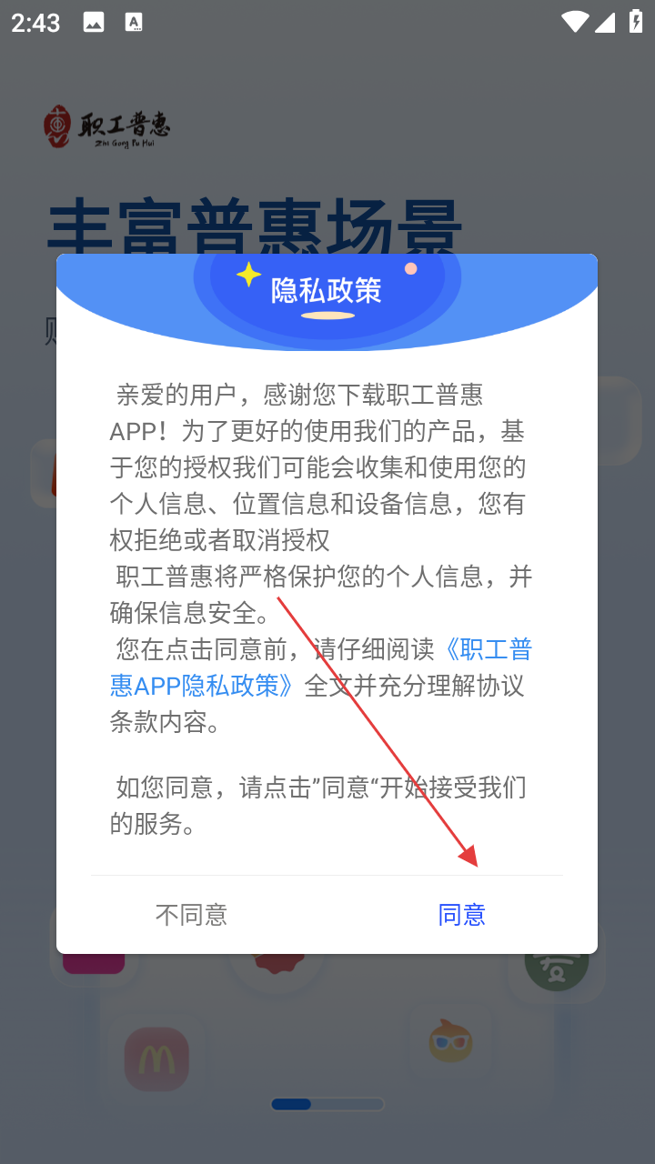 1、打开应用阅读隐私政策弹窗点击【同意】。