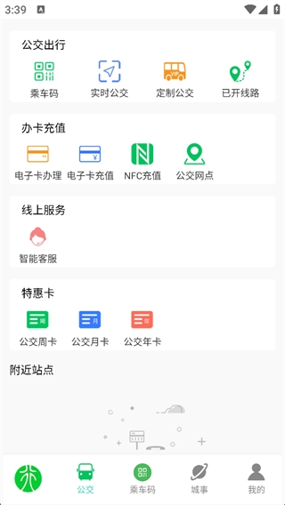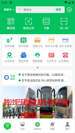 集合核心功能入口,涵盖乘车码、实时公交、卡券、NFC 充值等,还提供公交资讯,是用户获取公交服务和城市公交信息的主界面。