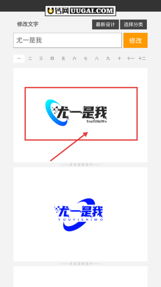 3、在设计结果页面,选择心仪的LOGO样式如带有蓝色图形的尤一是我LOGO。