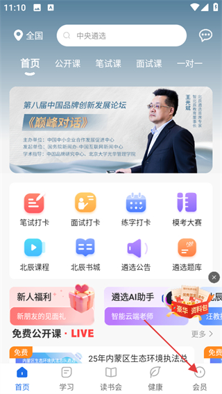 1、进北辰遴选首页,点击底部会员,进入会员页面。