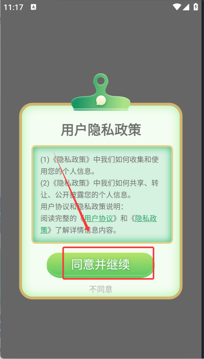 1、阅读并同意用户隐私政策,点击“同意并继续”以接受条款。