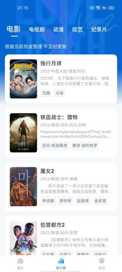 蓝光影院安卓版是一款非常不错的影视播放类软件,通过该软件你可以将全球影视作品、综艺节目以及最新院线电影一网打尽,且完全免费观看,无需充值vip会员,从而让你可以尽情的享受到影视资源所带来的追剧乐趣。在这个软件里拥有着许多其他同类型软件所没有的优点,即点即看、找片容易、片源好、更新快、蓝光画质等优点都是应有尽有的,为你带来极致的使用体验和观看体验。另外,本软件提供了排行榜板块,而在该板块中你可以看到各大影视类型的榜单,而每个能够上榜的影视作品都是同类型影视作品中的佼佼者,为此非常值得你来这里寻找并观看。感兴趣的用户,赶紧来本站下载吧。