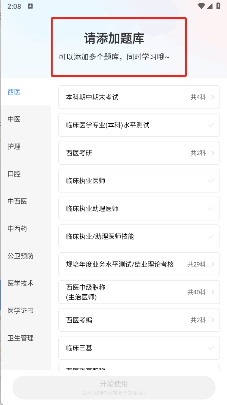 1、在题库页面,点击“请添加题库”按钮,选择需要的题库进行添加。