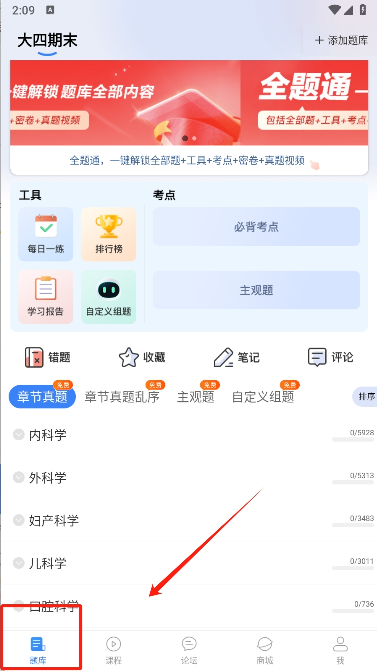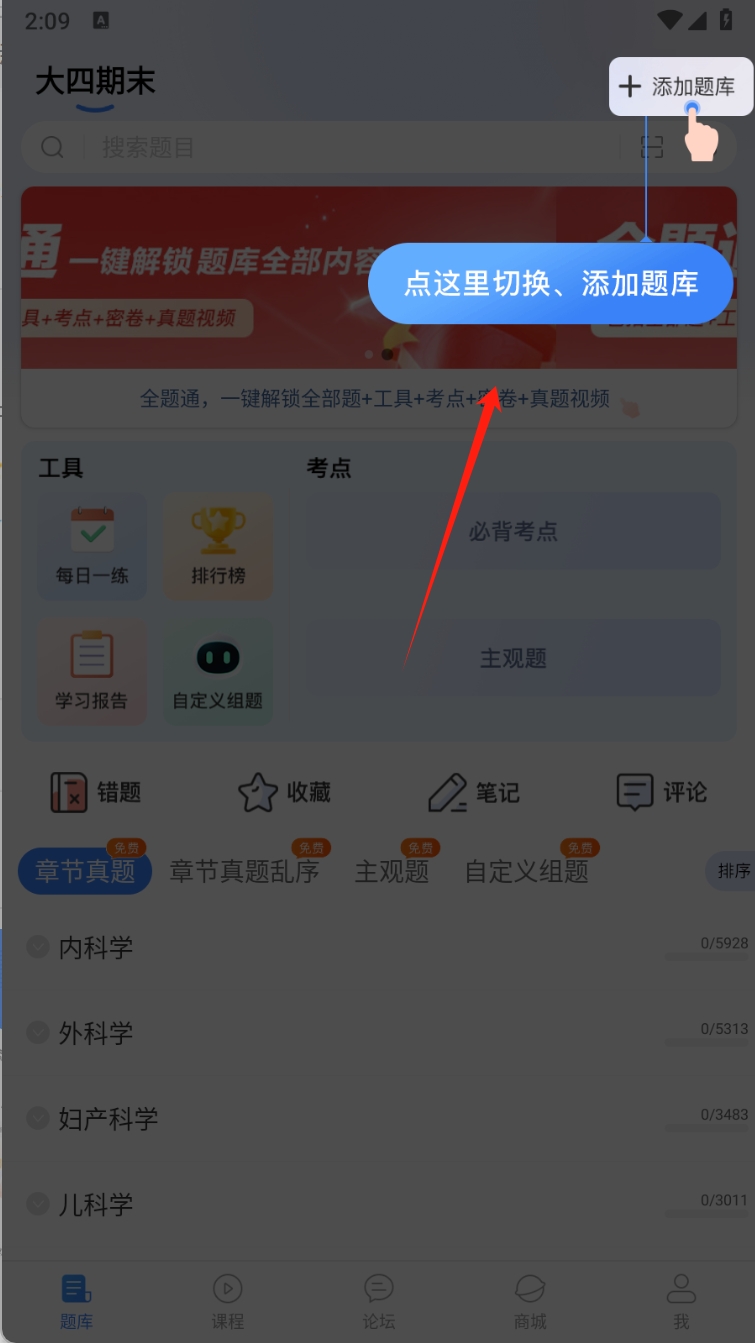 2、在学习页面,点击右上角“添加题库”按钮,选择并添加新的题库。
