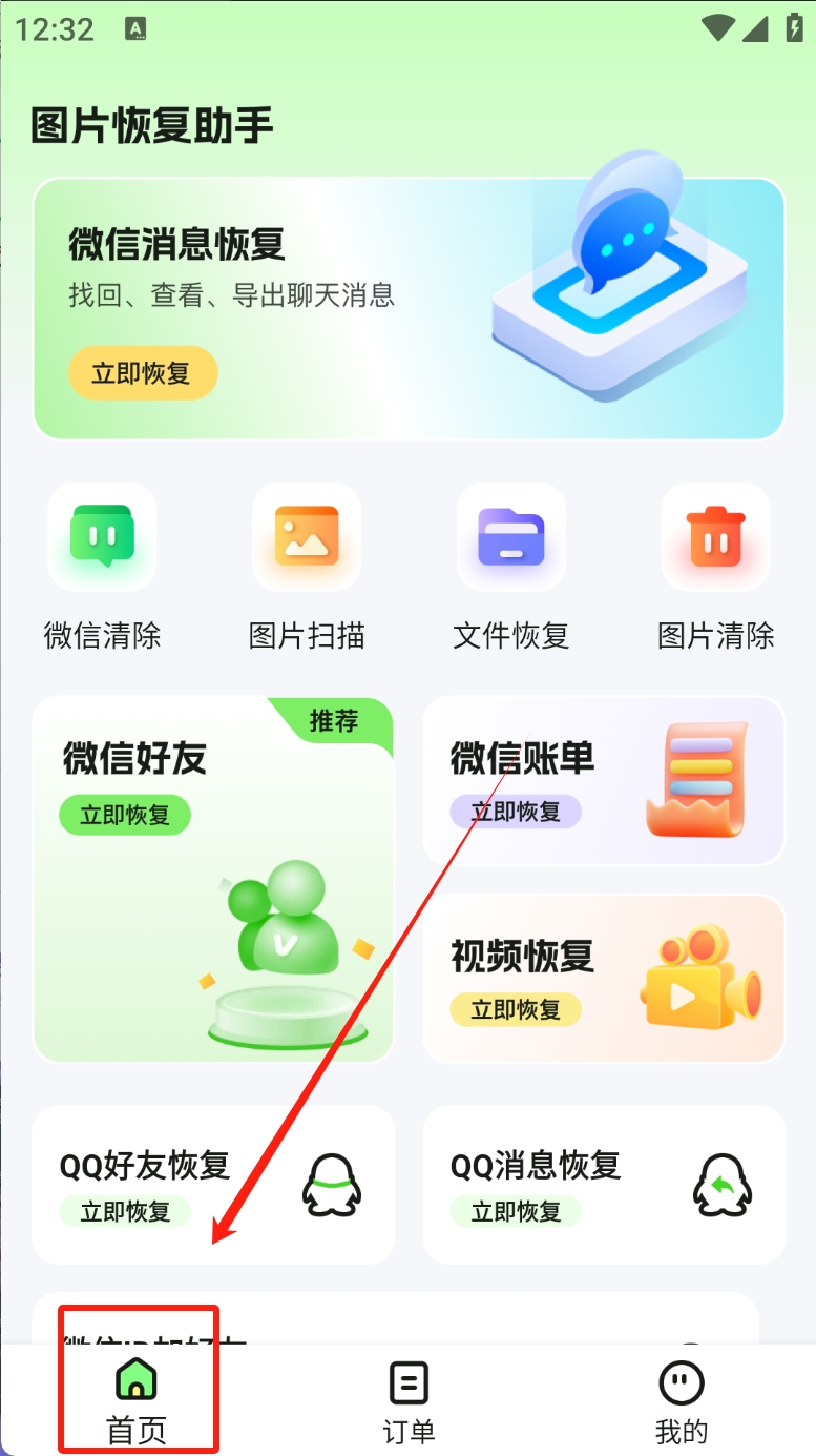 1、打开应用,点击首页的“微信消息恢复”按钮,开始恢复微信聊天记录。