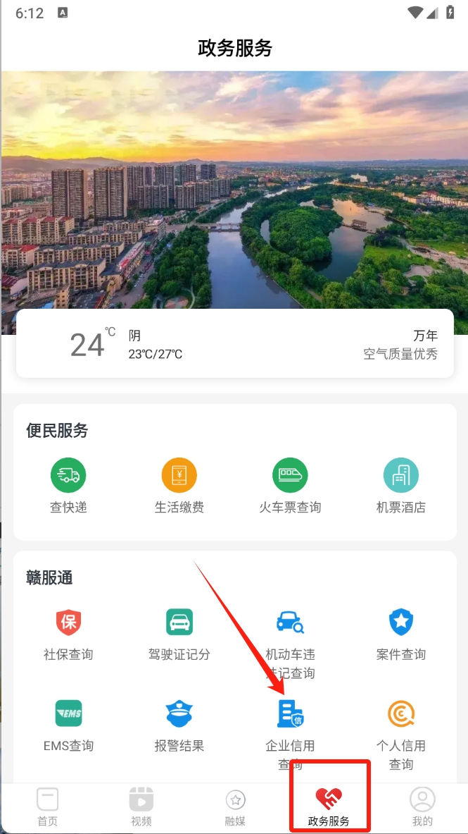 2、接着,点击“政务服务”按钮,进入政务服务页面,在这里您可以查询天气、办理便民服务等。