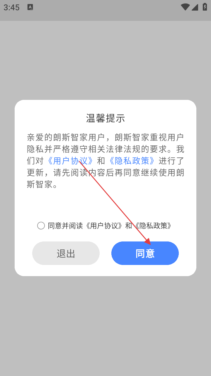 1、打开【朗斯智家】应用,页面会弹出温馨提示框,然后点击【同意】按钮,进入后续页面。