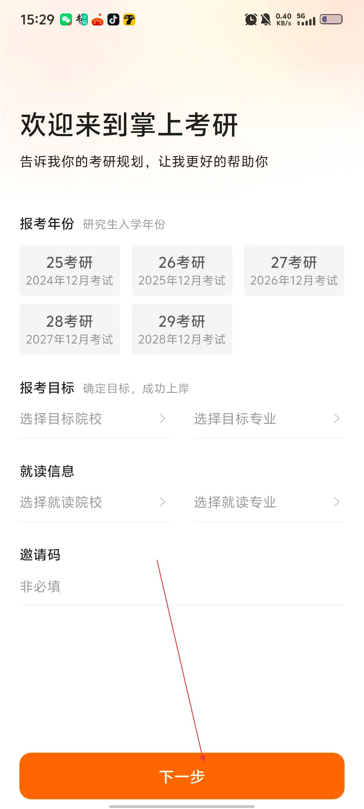 1、首次打开【掌上考研】后,请先根据指引选择你的【报考年份】和【报考目标】,并完善【就读信息】以便获取个性化服务。