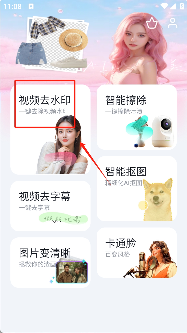 1、打开应用,选择“视频去水印”功能,进入去水印页面。