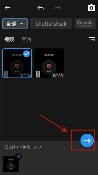 3、创建项目后APP会进入手机的内部存储器,里面列出了所有的视频图片以及文件夹,然后在需要剪辑的视频上面点击一下,点击视频右侧的加号即可添加。如果一个文件夹内视频过多,还可以点击右上角的符号进行排序赛选。选取好了视频点击底部右上角的勾,然后进入编辑界面。