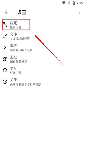 1、在软件界面选择“设置”,在“设置”界面中,点击“应用设置”设置项。