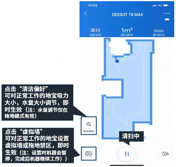 机器在工作过程中,点击左下角“虚拟墙\"或“清洁偏好”图标均可进行设定。