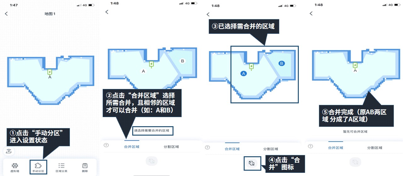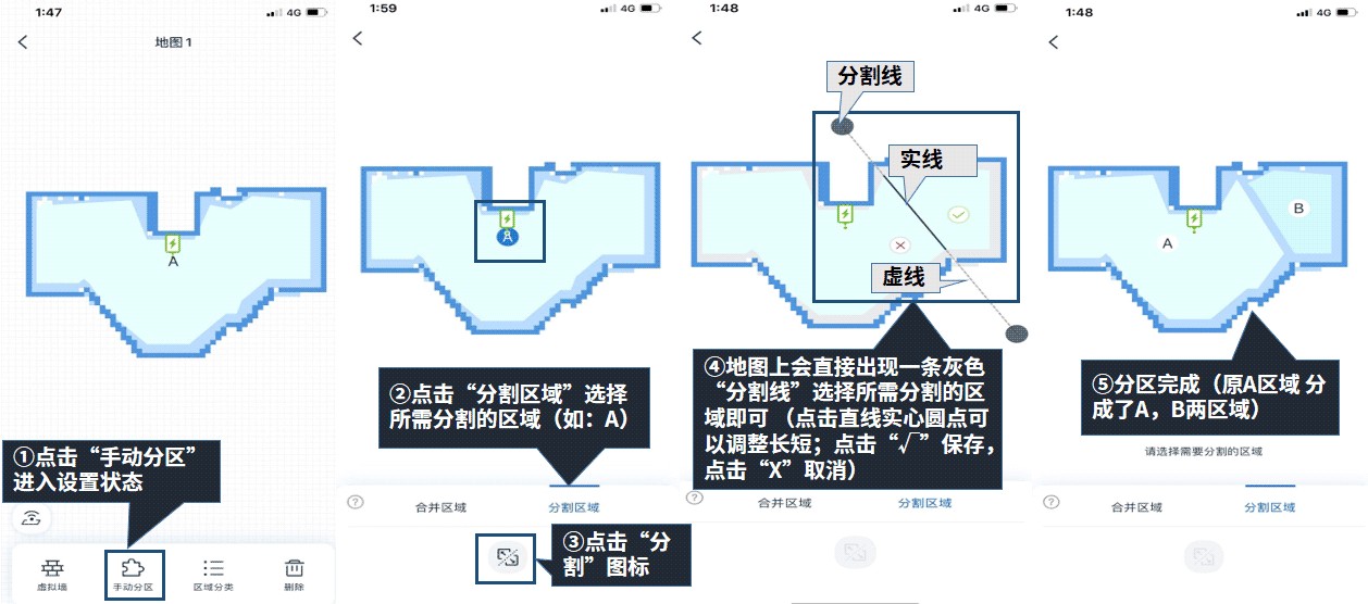 四、手动分区设置(适用于固件版本1.5.3及以上,需搭配ECOVACS HOME版本1.5.5及以上一同使用)