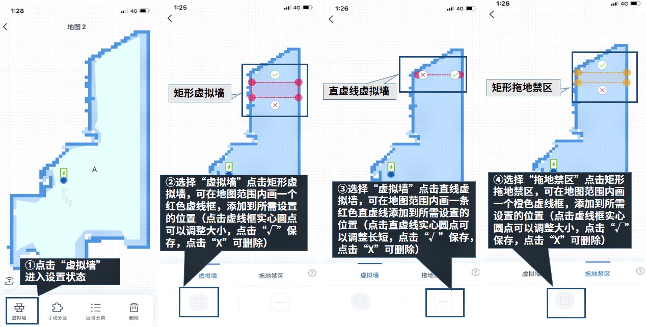 若有需要,可在地图范围内手动绘制“虚拟墙”或“拖地禁区” 。完成调整后,点击“√”进行保存。要是想删除或编辑已设定好的虚拟墙或拖地禁区,点击已绘制好的虚拟墙或拖地禁区,然后执行删除或编辑操作。