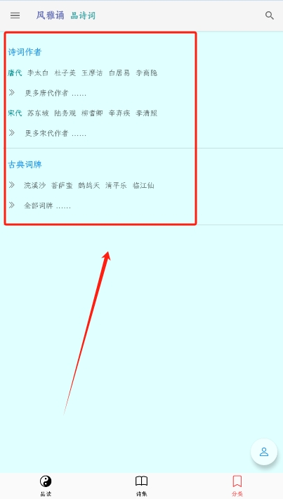2、浏览各类古典诗词,韵文等,根据兴趣点击阅读,详细注释帮助理解每篇内容的深层含义,适合不同水平的学习者。