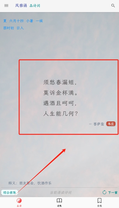 风雅诵诗词汇聚了丰富的诗词资源,旨在为学习者提供便捷的学习方式,让用户随时随地获得喜爱的知识,体验高效的学习服务,内置语音播读功能,清晰传达每篇文章的内容,助力提升口语能力与理解力。