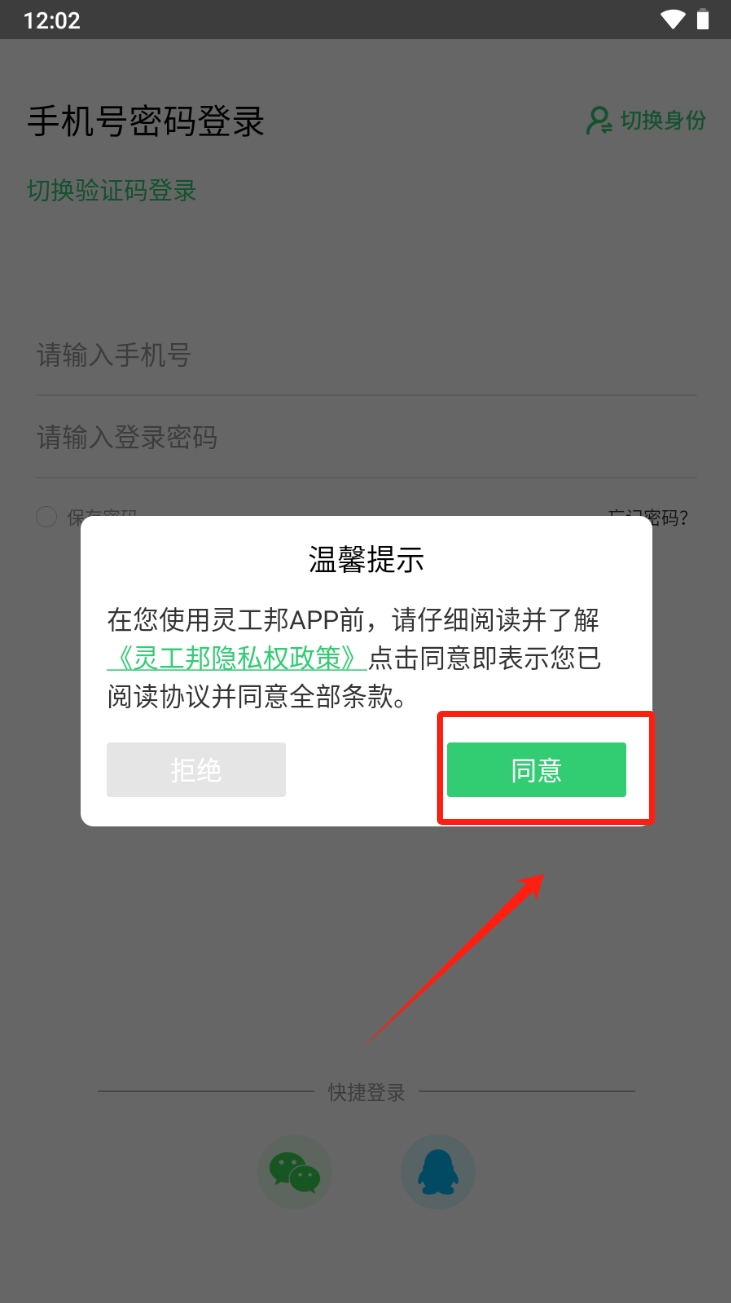 2、在登录页面,点击“同意”按钮以接受隐私权政策。