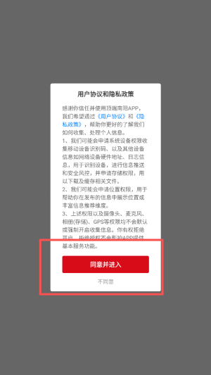 1、阅读并同意用户协议和隐私政策,点击“同意并进入”按钮以继续。