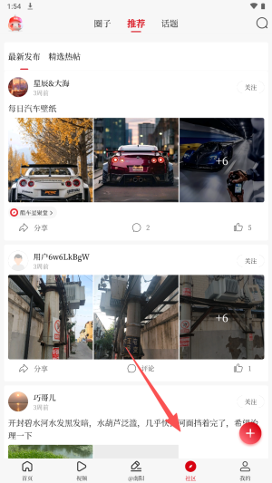 4、在社区互动页面,点击底部的“+”号,分享您的图片或视频内容。