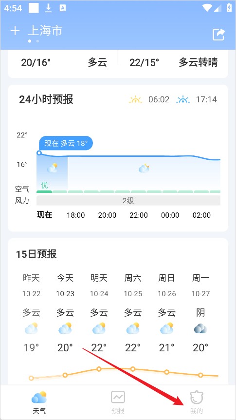 1、打开橡果天气App后,点击右下角的【我的】进入个人中心;