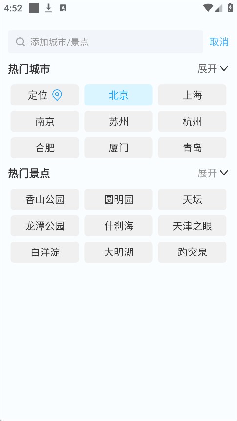 3、输入或选择想要关注的城市名称,确认后即可在首页查看该城市的实时天气信息。