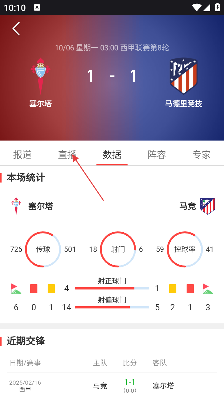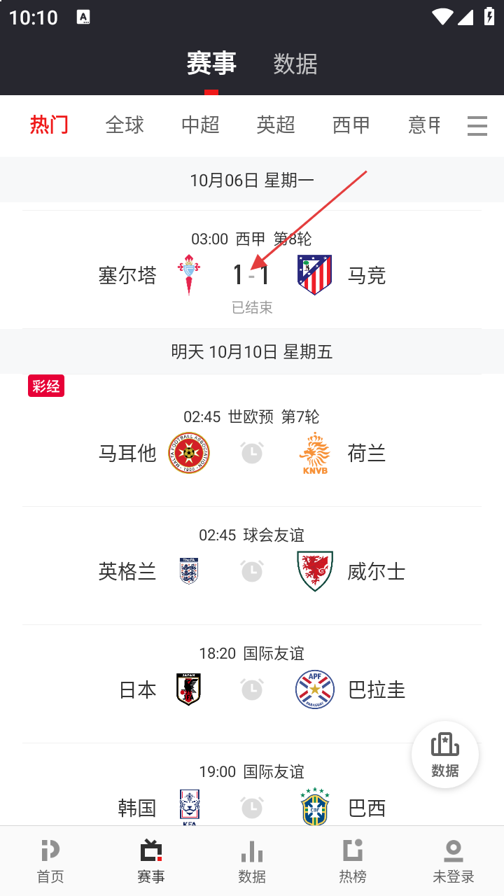 2、在赛事页面,可查看各类赛事信息,点击感兴趣的赛事,如西甲第8轮塞尔塔vs马竞。