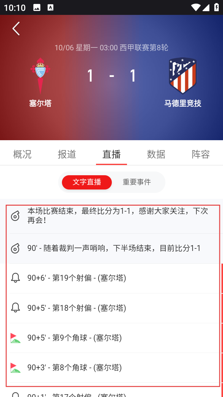 4、点击后,即可查看该赛事的文字直播,了解比赛进程等信息。