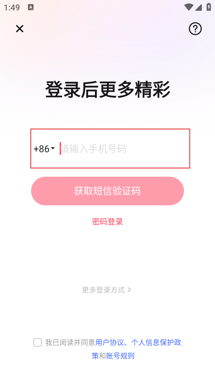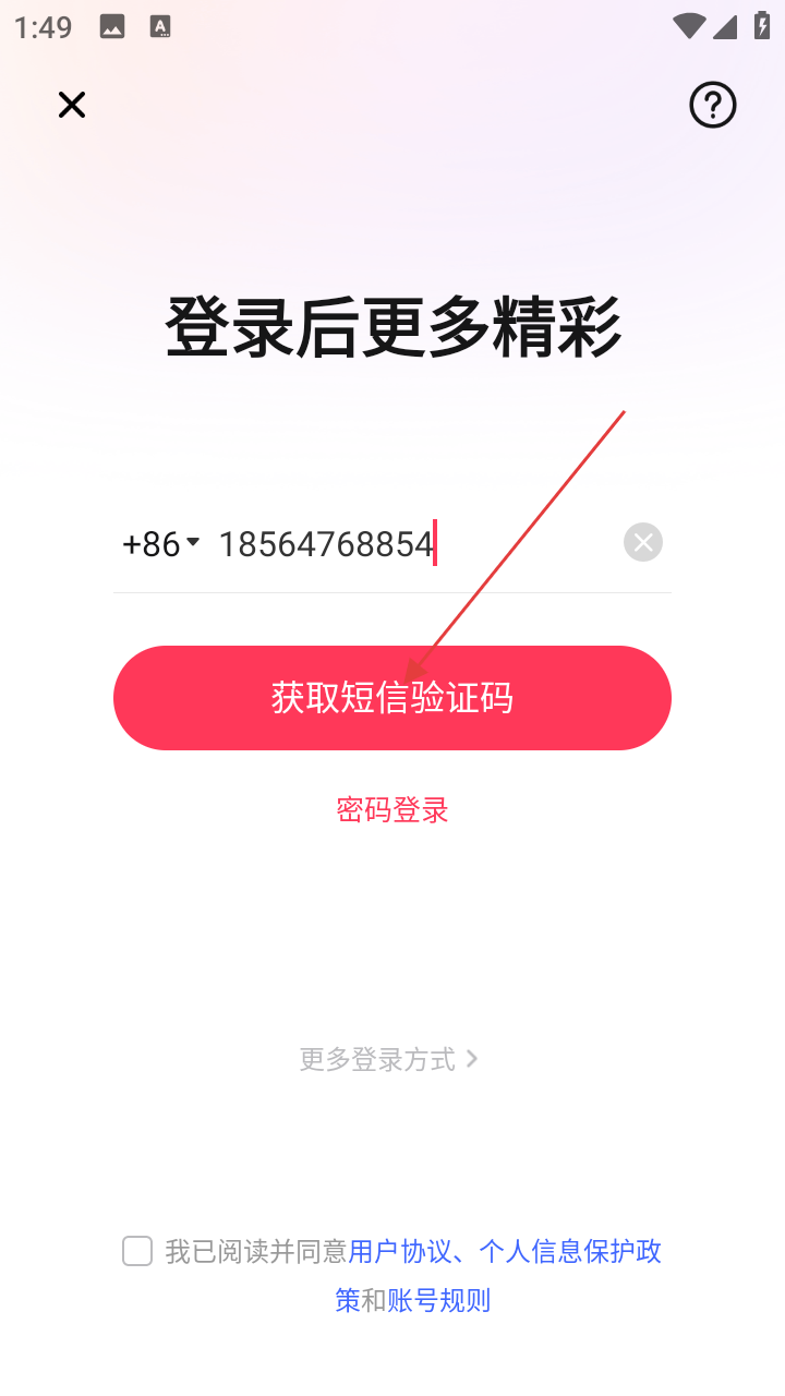 3、在登录注册界面,输入手机号码,勾选已阅读并同意相关协议等选项。