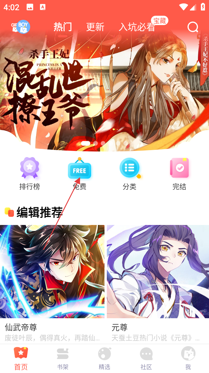 1、在软件首页,点击【FREE-免费】选项,进入免费漫画页面。