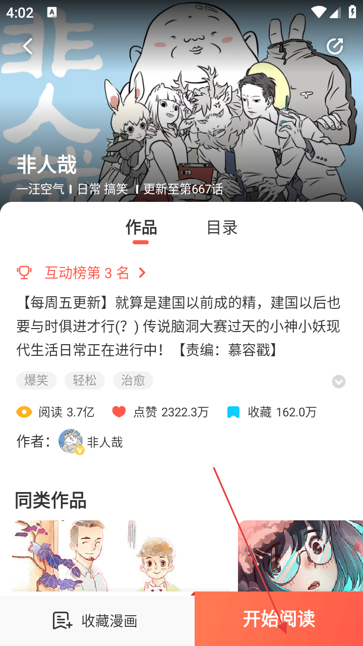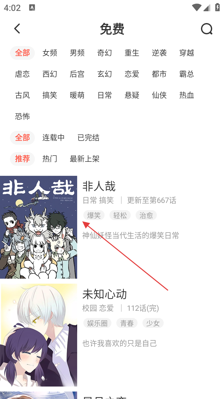 2、在免费漫画页面,找到心仪的漫画,如【非人哉】并点击,进入漫画详情页。