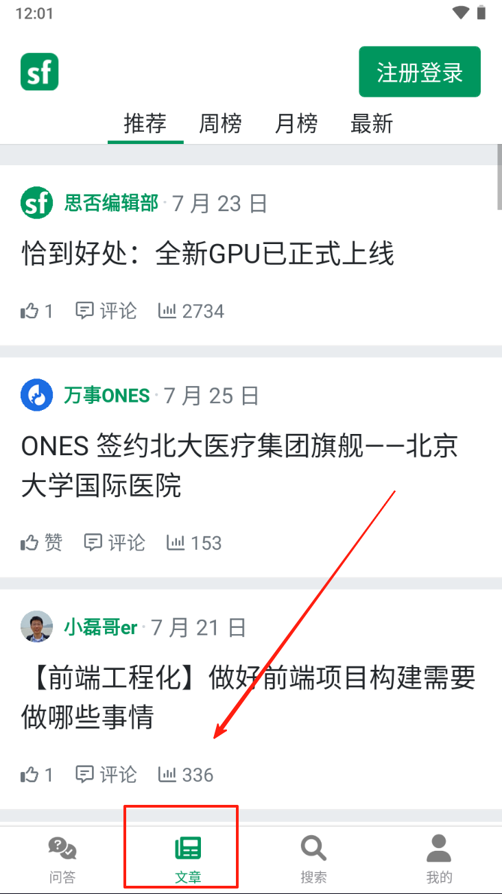 2、点击“文章”进入文章页面,浏览推荐文章和热门话题。