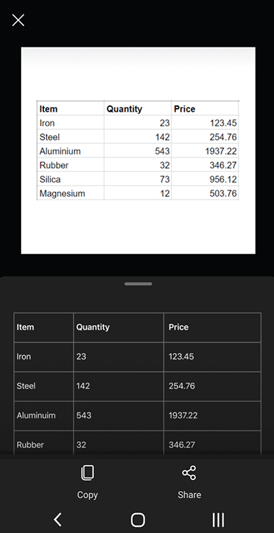 3.提取后可在其他App中复制或分享表格内容。