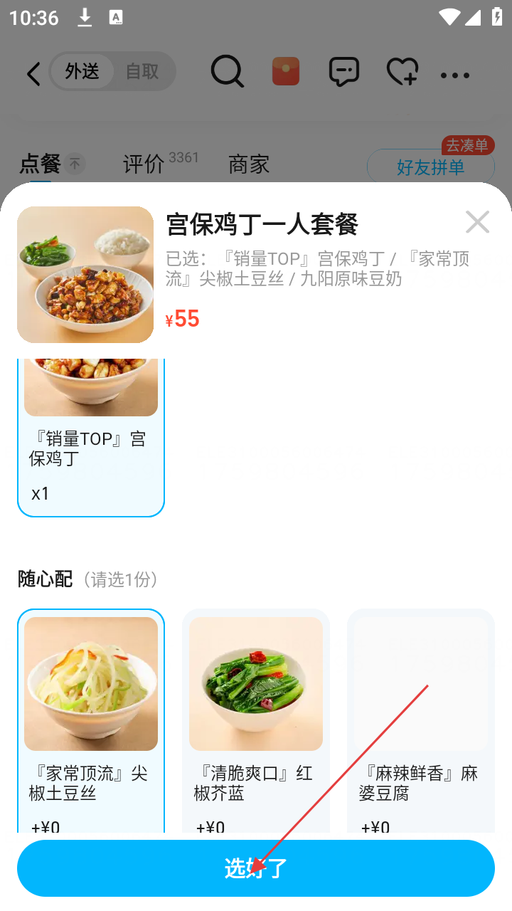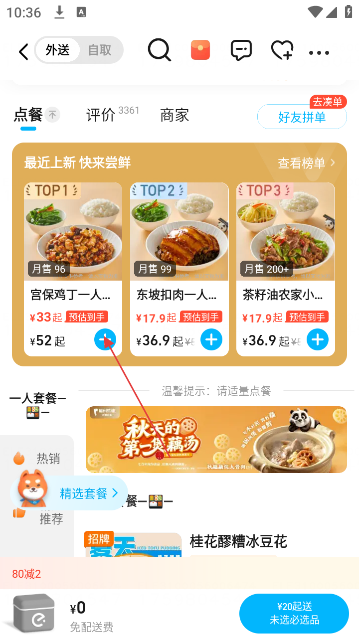 3、在商家点餐页面,浏览菜品,选择【宫保鸡丁一人套餐】,点击【加入购物车】。