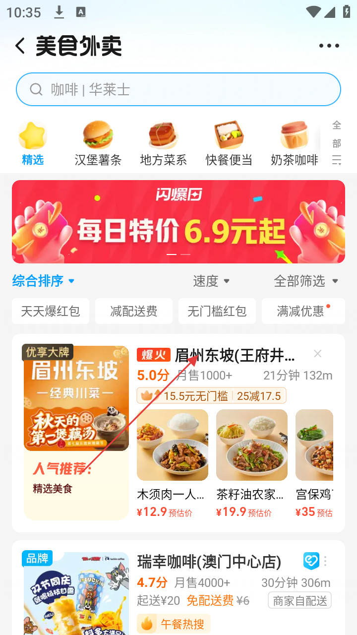 2、在美食外卖页面,浏览推荐商家,选择【眉州东坡】,进入商家点餐页面。