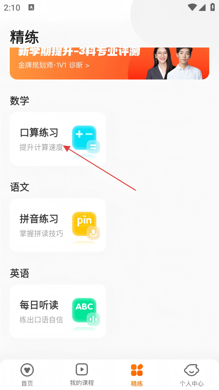 2、在精练页面,找到数学板块的【口算练习】,点击进入。