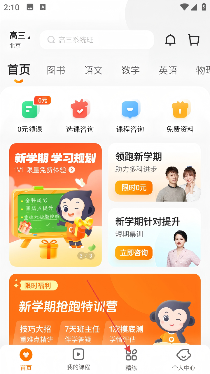1、打开猿辅导APP,点击底部【精练】选项,进入精练页面。