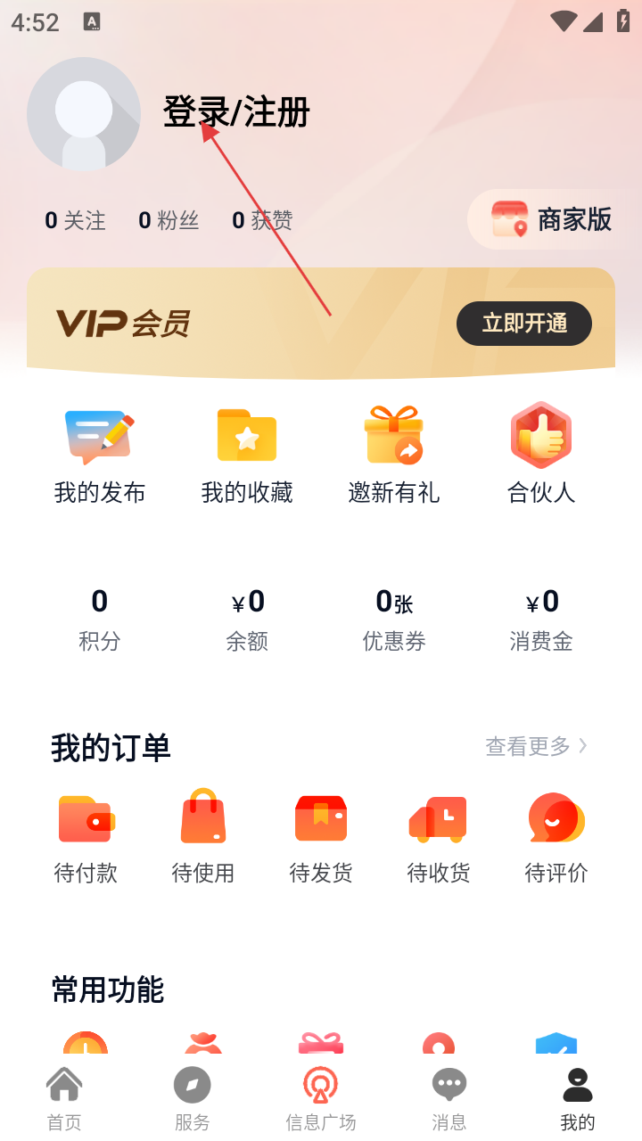 2、进入个人页后,可通过【登录/注册】账号,还能查看VIP会员、订单及常用功能。