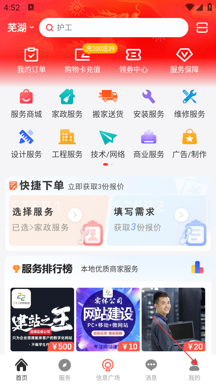 1、进入软件首页,可利用搜索框找服务,也能从【服务商城】【家政服务】等入口选,点击底部【我的】。