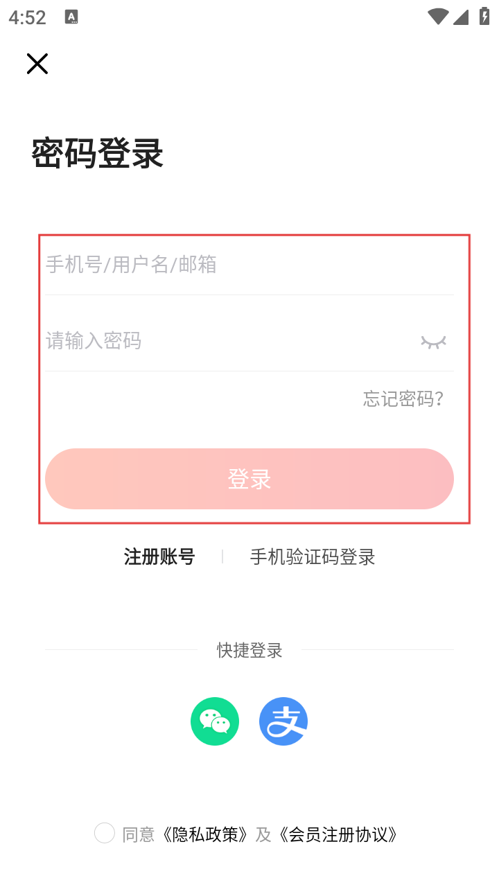 3、来到【密码登录】页,可输入手机号/用户名/邮箱和密码登录。