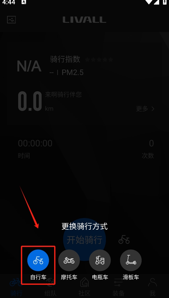 2、在骑行模式选择页面,点击“自行车”图标,选择自行车作为骑行方式。