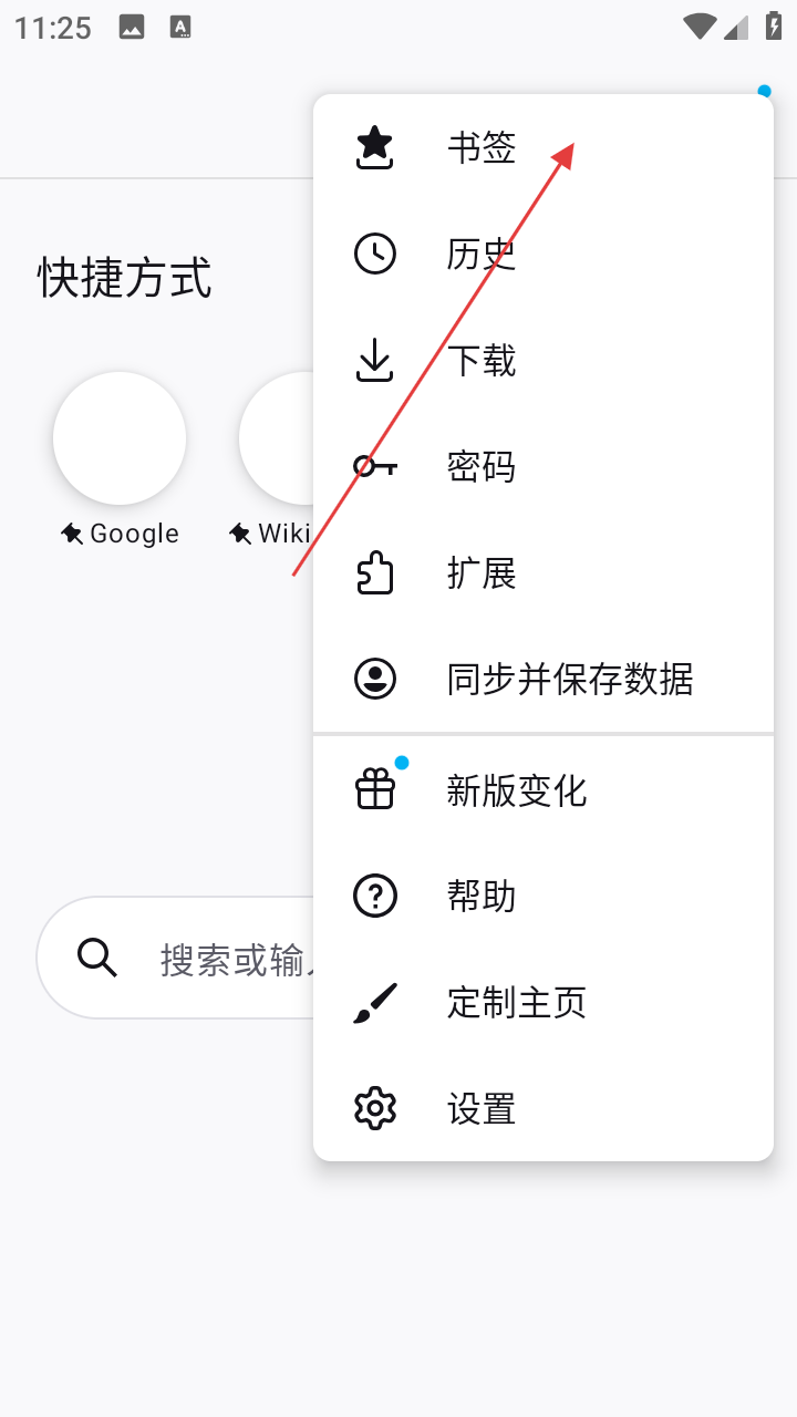 2、在展开的菜单里,找到并点击【书签】选项,进入书签管理页面,查看书签相关内容。