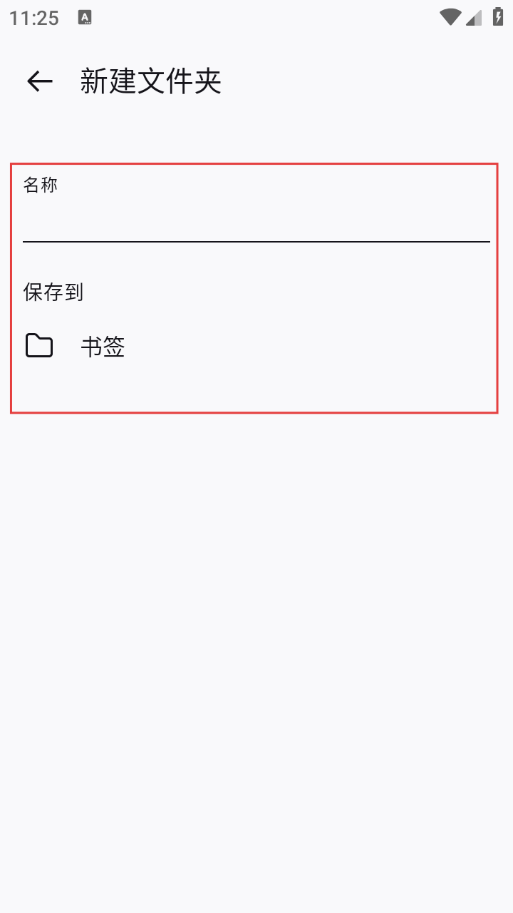 4、在新建文件夹页面,填写文件夹名称,选择保存到【书签】目录,即可完成书签文件夹创建。