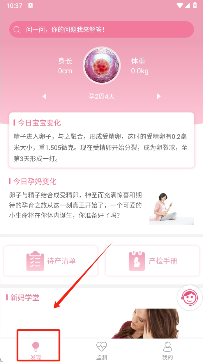 2、查看宝宝和孕妈变化 。在发现页面,可以查看今日宝宝变化和今日孕妈变化,了解孕期的每一天宝宝和自身的变化情况。