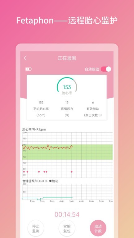1、胎心监测数据分析,自动生成专业报告图表,异常情况即时预警,支持在线咨询医疗专家。