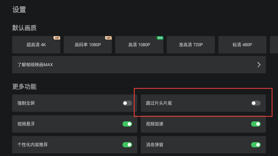 3、在设置界面的“更多功能”板块,我们能看到【跳过片头片尾】选项,它当前是关闭状态。
