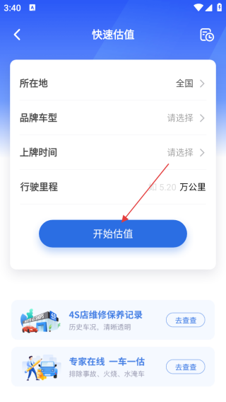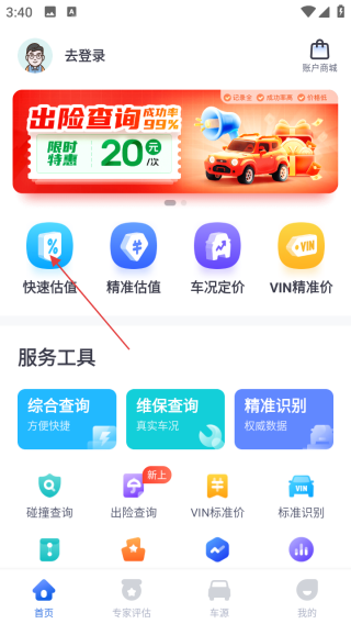 1、进入首页,点击【快速估值】功能,开启车辆估值流程。