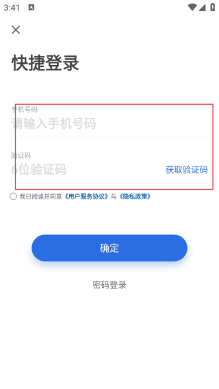 4、若需登录,在快捷登录页填入手机号码,获取并填写验证码,勾选协议后点击【确定】完成登录。