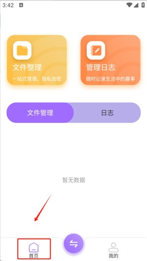 1、首先,打开应用程序,点击底部的“首页”按钮,进入主界面。在这里,你可以看到“文件整理”和“管理日志”两个主要功能选项。